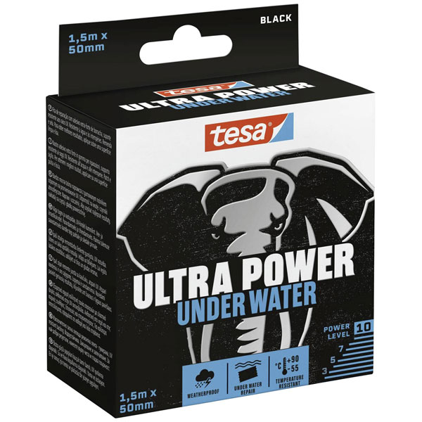 tesa's Ultra Power Underwater Repair Tape is ideal for repairing leaks, even underwater. This robust tape measures 1.5m in length and 50mm in width, coming in a single black piece. It is perfect for use in wet environments, such as plumbing or outdoor water fittings.