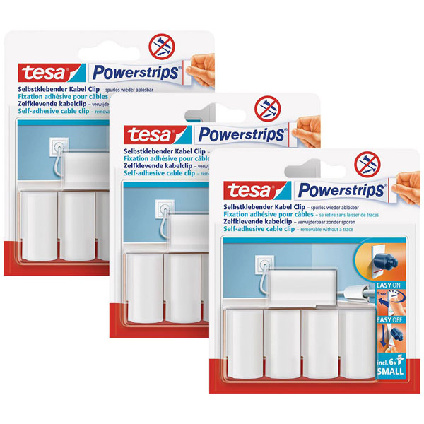 The tesa POWERSTRIPS® Cable Clips are a product by tesa, consisting of 15 self-adhesive clips. These clips are ideal for organising cables neatly and can be easily applied to various surfaces without causing damage. They are commonly used for securing cables in living areas and office environments to reduce clutter.