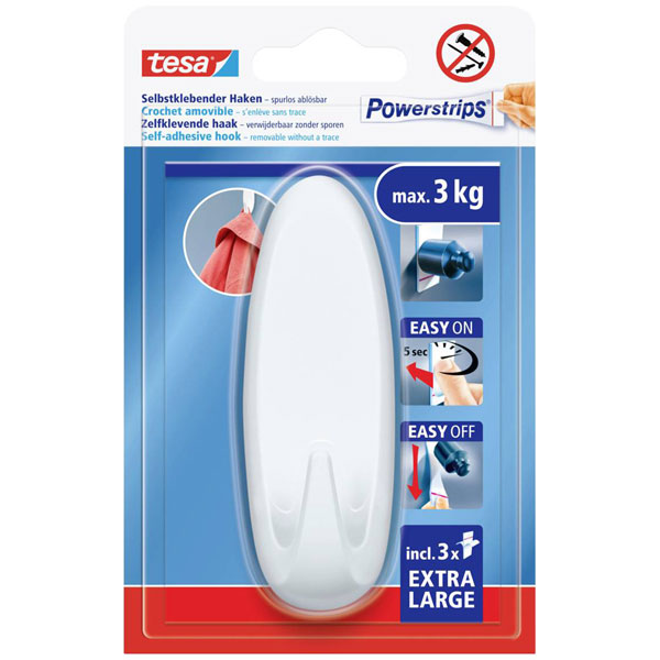 tesa 59025-00000-00, offers the tesa Powerstrips XL Oval adhesive hook in white, also referred to as product 3365419. This product is designed for secure, adhesive-based fastening on various surfaces, providing a reliable and convenient solution without the need for drilling. The hook boasts a discreet oval shape and robust adhesive technology, making it ideal for hanging lightweight items such as towels, coats, and other accessories in domestic and workplace environments. Engineered for optimal adhesion and easy removal, this product finds typical applications in homes, offices, and temporary event setups where flexibility and surface integrity are paramount. Proper surface preparation is essential for maximising the hook's performance and longevity.
