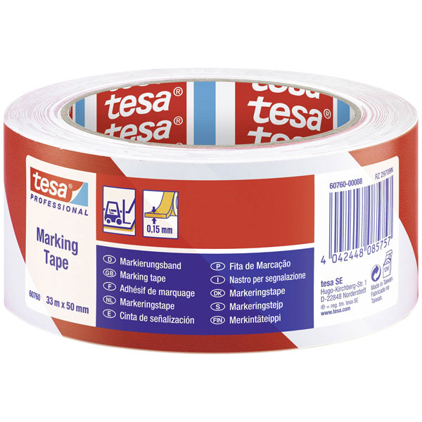 The tesa 60760-00088-15 floor marker tape, manufactured by tesa, features a red and white design and measures 33m in length and 50mm in width. It is a warning adhesive tape specifically designed for marking floors and enhancing safety in various environments. Typical applications include outlining hazardous areas, guiding foot traffic, and delineating workspaces.