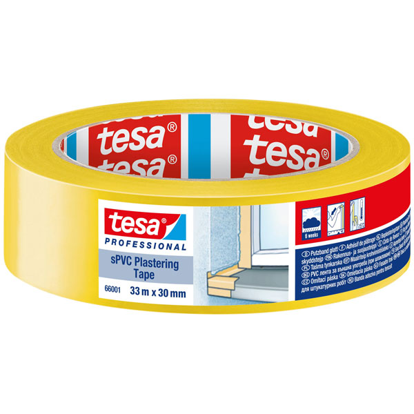 The tesa® Professional Plastering Tape, manufactured by tesa, is a yellow PVC adhesive tape measuring 33 metres in length and 30mm in width. It features strong adhesion and excellent resistance to various weather conditions, making it ideal for outdoor use. Common applications include masking windows during painting, protecting facades, and general plastering tasks.
