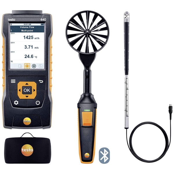 The Testo 440 Set contains a compact hand-held meter, a Bluetooth handle and handle adapter, a vane probe (Ø 100 mm) and impeller probe (Ø 16 mm). Both probes are Bluetooth-enabled and have a temperature sensor. The Testo 440 hand-held measuring device is supplied with batteries and is ready for use immediately! To Set a suitable combination case included.