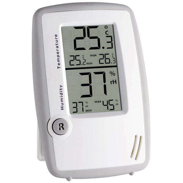 The TFA Dostmann Digital Thermo-Hygrometer measures indoor air humidity and temperature simultaneously. Key features include a mould warning device and high-precision monitoring suitable for detecting building moisture. It is typically used in homes and construction sites to prevent mould growth and ensure healthy indoor air quality.