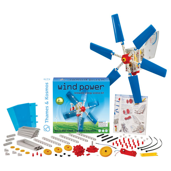 First, assemble a wind turbine complete with electric generator, adjustable rotors, and wind speed indicator. Then, conduct more than 20 experiments with your wind turbine, including experiments with different numbers of rotor blades, different blade angles and profiles, different wind speeds, different gear ratios, and so on. Use the wind turbine to generate mechanical power to lift a heavy weight or generate electricity to light up an LED and charge a rechargeable battery.