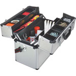 This aluminium pilot tool box from Toolcraft has been designed to allow plenty of space for small parts like screws and pins, etc, while the plastic trays in the fold-out elements can be adjusted with dividers. There are additional adjustable compartments in the base of the case, with two lockable clasps and reinforced edges and corners.