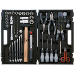 A 60-piece tool kit including 1/2in. drive socket set, high quality spanners, screwdrivers, pliers, hammer and crimp tool.