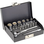 This 6.3mm mini ratchet set from Toolcraft has 26 pieces manufactured to a high quality with chrome vanadium steel, providing for best workshop quality. The power transmission from the nuts to the screw head is not via the corners, but via the flanks, ensuring higher power transmission, plus the sensitive edges of the nut remain intact. The ratchets offer insert tool unlocking at the touch of a button.