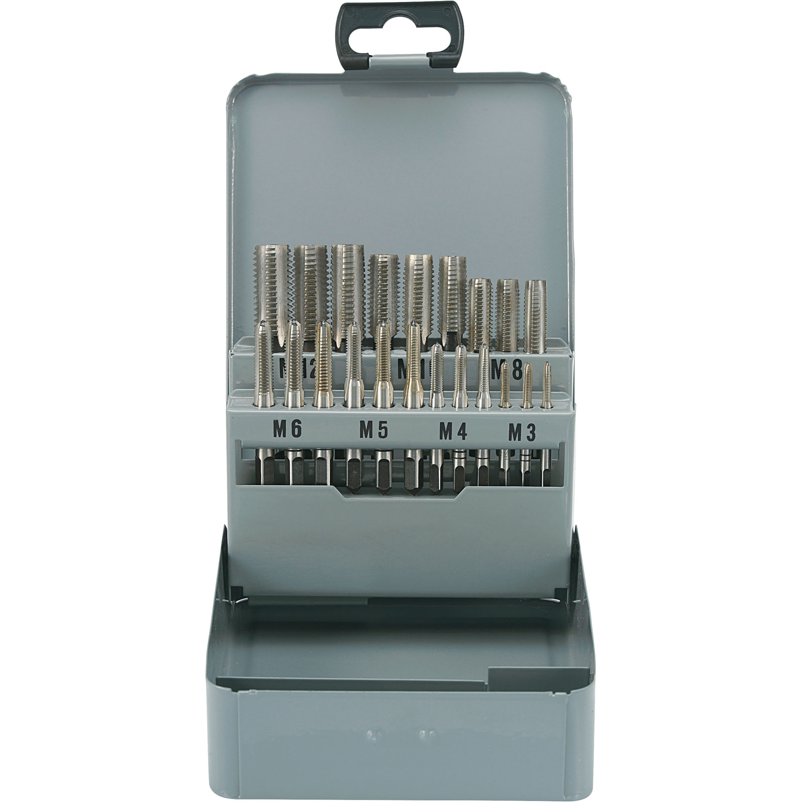 This set of HSS hand taps from Toolcraft includes 21 pieces in a sturdy, attractive steel box. Featuring a central/bottoming tap and the following pieces: M3/M4/M5/M6/M8/M10/M12.