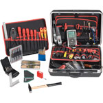 A comprehensive electronic / electrical / mechanical tool kit in a rugged ABS briefcase. The case has a strong aluminium frame with edge protection, 2 lockable flip locks, 1 combination lock, detachable tool boards and an A4 document compartment in the lid.