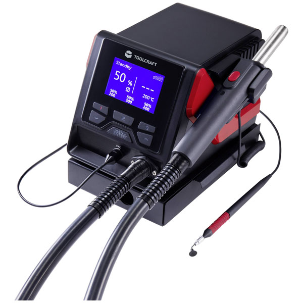 The Toolcraft TPS-800 is a digital hot air soldering station with a power output of 1000 W and an adjustable temperature range from 100 to 480 °C. Its precise digital controls make it ideal for detailed electronic work, ensuring efficient and accurate soldering. Common applications include circuit board assembly and repair tasks that require precise temperature management.