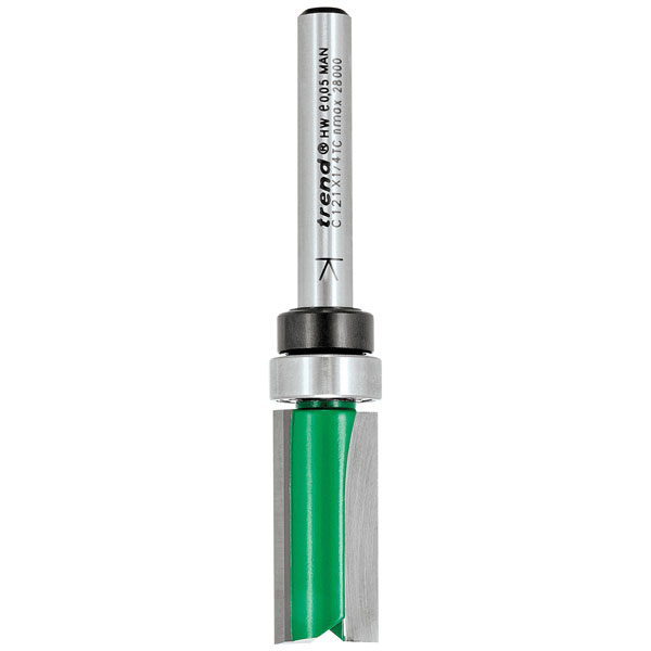 Trend Bearing Guided Template Profile Cutter for rebating and trimming edges. Extra care must be taken to avoid breakage of the cutter. Two flute carbide TCT tips for clean, professional finish on timber lippings, plastic laminates and veneers.
