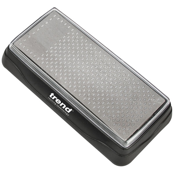 Oval holes design on fine side to collect and hold metal residue. Fine side also has clear solid area for small tools. Ideal for site and workshop. Use with plane irons and chisels. Suitable for all hand tools. Recommended for use with Trend lapping fluid to prevent clogging or rusting and assist in keeping tools clean.