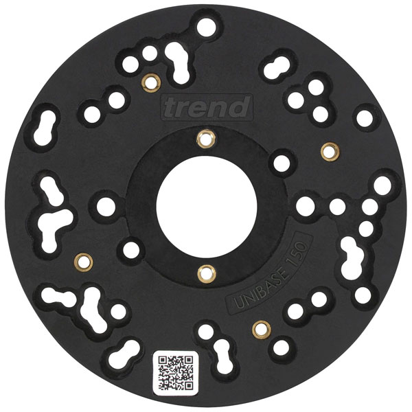 Trend UNIBASE/150 Universal Plunge Router Sub-Base with 13 Hole Patterns to suit most 1/4in plunge routers, including 18V cordless models.