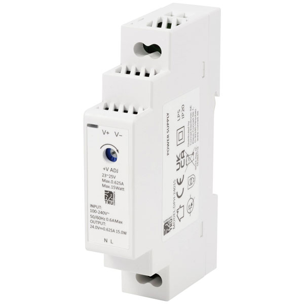TRU COMPONENTS TC-10580804, also known as the DPH-24015, is an industrial power supply unit designed for rail mounting applications. This DIN rail PSU provides a steady 24 V DC output with a current capacity of 0.625 A, delivering up to 15 W of power through a single output channel. Engineered for use in automated systems and machinery, the unit is ideal for integration into control panels and various industrial environments where reliable power distribution is critical. The product's design favours ease of installation and maintenance, making it a practical choice for engineers tasked with setting up or retrofitting power supply configurations in industrial settings. Its compact form factor allows for efficient space utilisation within equipment enclosures, maintaining a tidy and accessible setup.