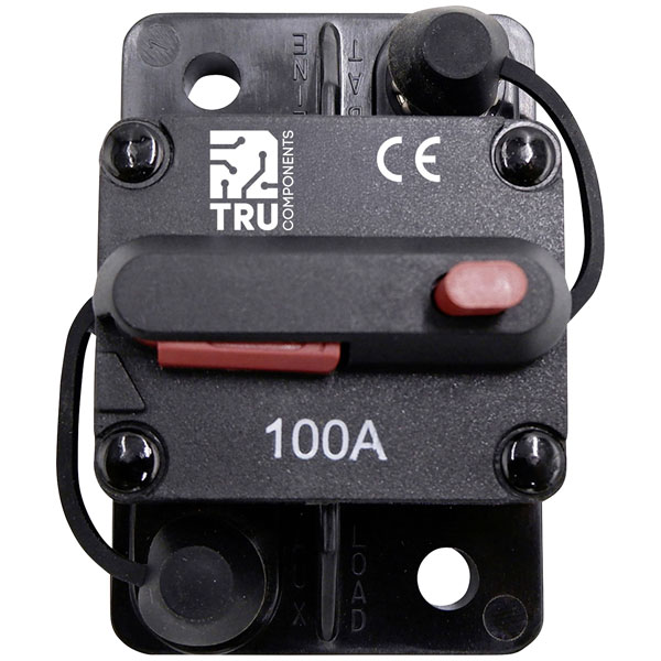 TRU COMPONENTS TC-13596600 is a robust automotive fuse circuit breaker designed to handle a rated current of 100 A. This component is encased in a durable black housing, making it suitable for various vehicular electrical systems, including car stereos and lighting applications. Depicted as an efficient alternative to conventional light bulbs and car fuse solutions, this circuit breaker offers effective overcurrent protection in 12 V automotive electrical systems. It is particularly well-suited to prevent damage in circuits powering high-demand accessories or custom installations, ensuring the electrical integrity and reliability required by modern automotive engineering.