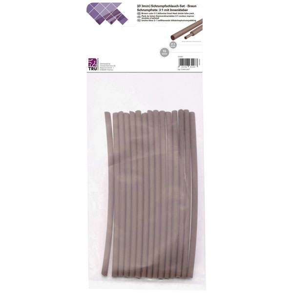 The TruComponents T1902CA027 heatshrink set comprises 15 pieces of brown, 3mm diameter heat shrink tubing. With a shrinkage ratio of 3:1, it ensures a snug fit over cables, wires, and connectors, providing excellent insulation and protection. Ideal for both professional electrical work and DIY projects, this durable set is essential for secure and neat cable management.