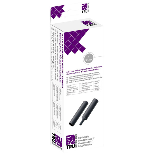 TruComponents T1904CA046 heat shrink features a shrink ratio of 4:1, transitioning from 32 mm to 8 mm, in a sleek black finish. This high-quality heat shrink includes an adhesive lining, ensuring a secure and durable seal perfect for insulating and protecting wire connections. Ideal for various electrical and automotive applications, it provides exceptional protection against moisture and environmental contaminants.