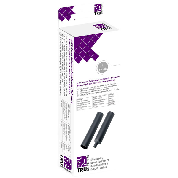 TruComponents T1904CA049 heat shrink with adhesive is a versatile, high-performance product in elegant black. Featuring an impressive shrinkage ratio of 6:1, it ranges from 44.40 mm to 7.40 mm, providing a reliable seal and protection for components. Ideal for electrical insulation, cable grouping, and strain relief, it ensures longevity and durability in demanding applications.
