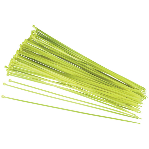 TruComponents 93038c412 Cable Tie, measuring 200 mm by 2.50 mm, in a luminescent yellow. These versatile ties are ideal for efficient cable bundling and management, providing strong and durable support in both professional and domestic settings. Supplied in packs of 100, they are suitable for organising cables in offices, workshops, or homes, and are particularly useful in low-light conditions due to their luminescent feature.