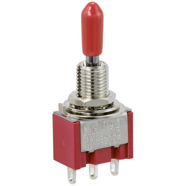 The TruComponents 751505 Toggle Switch is a high-quality, reliable component designed for a wide range of applications. This Single Pole Double Throw (SPDT) switch offers an On/On functionality, making it ideal for controlling two different circuits with a single switch. The chrome-plated toggle has a removable red insulating sleeve.