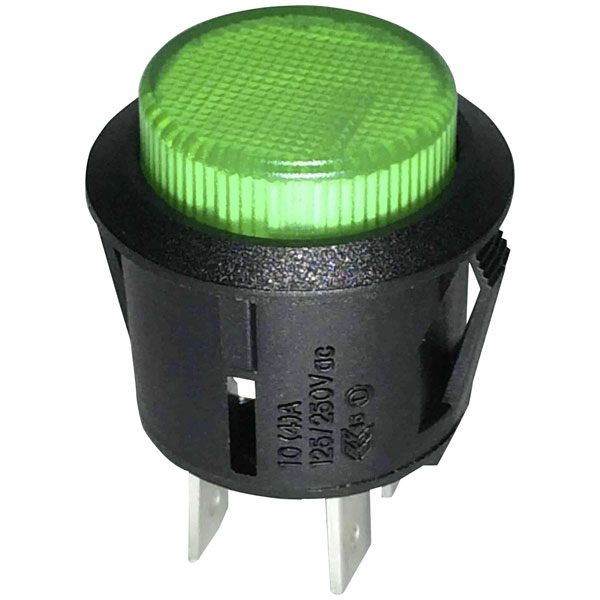 The TruComponents 78-1970 Green Pushbutton is a latching, illuminated switch rated at 250 V AC and 1.5 A. Flattened on both sides for front panel locking, with Snap-in mounting. It has an SPST configuration with an Off/(On) function, making it suitable for various electronic devices.