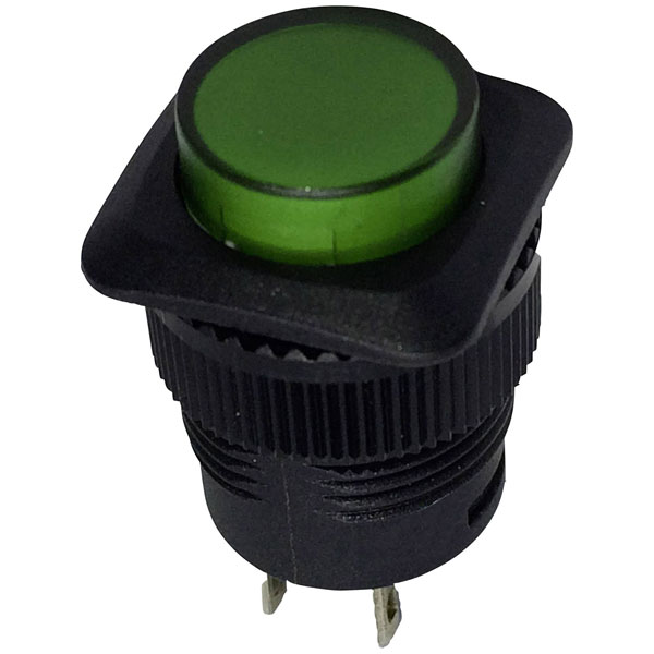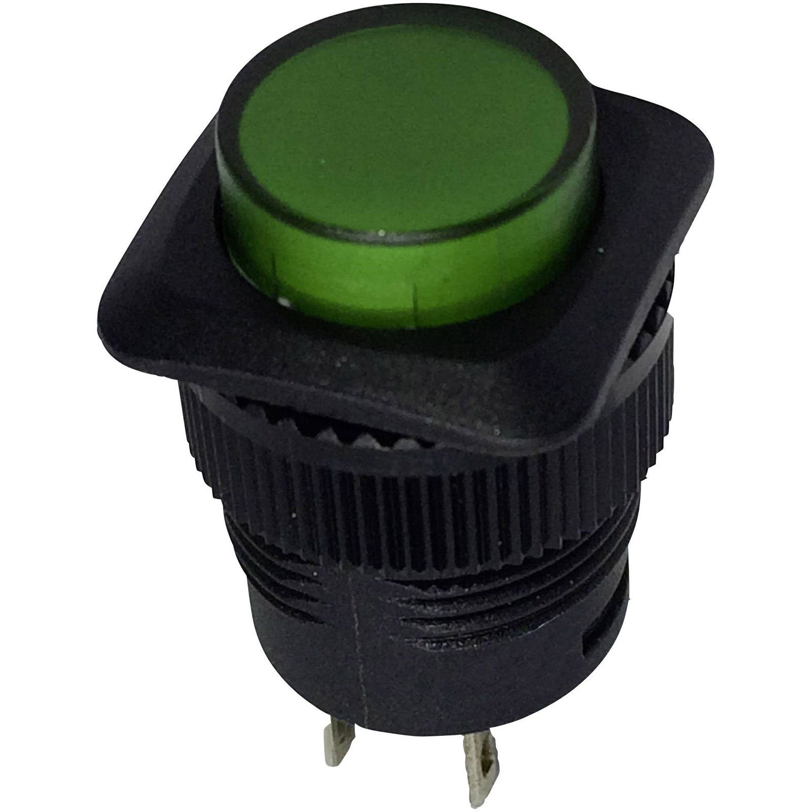 The TruComponents 78-1981 Green Pushbutton is a panel mount switch, designed for off/(on) momentary action with a SPST normally open configuration. It features a voltage rating of 25 V AC and a current rating of 1.5A, suitable for electronic switching applications. This switch is ideal for use in control panels and other applications requiring reliable momentary contact functionality.