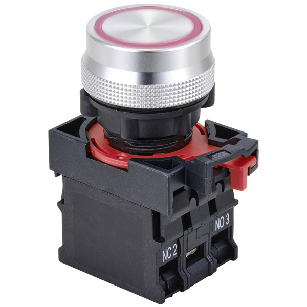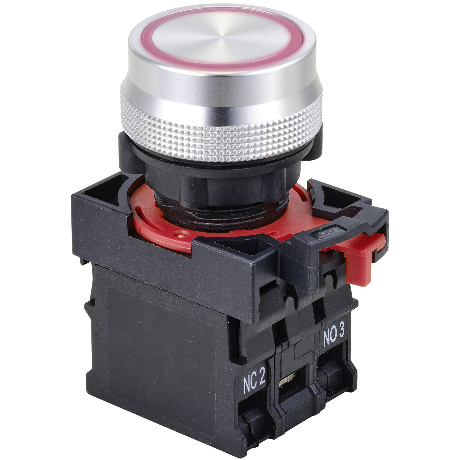The TruComponents pushbutton is a panel mount, momentary switch with a configuration of NO/NC. It features a voltage rating of 250 V and a current rating of 5 A, with a red illuminated button and IP40 protection. Typical applications include use in control panels and industrial equipment where temporary switch activation is required.