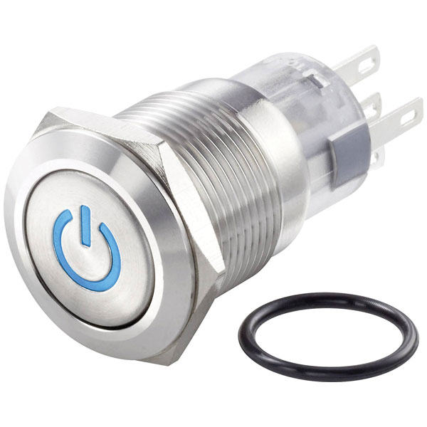 TruComponents manufactures the TC-7494500 pushbutton, a tamper-proof panel mount type. Featuring an Off/On latch, it is rated at 250 V AC and 3 A, with IP65 protection suitable for harsh environments. Typical applications include industrial control panels, where its NO/NC configuration and blue illumination provide clear and reliable operation.