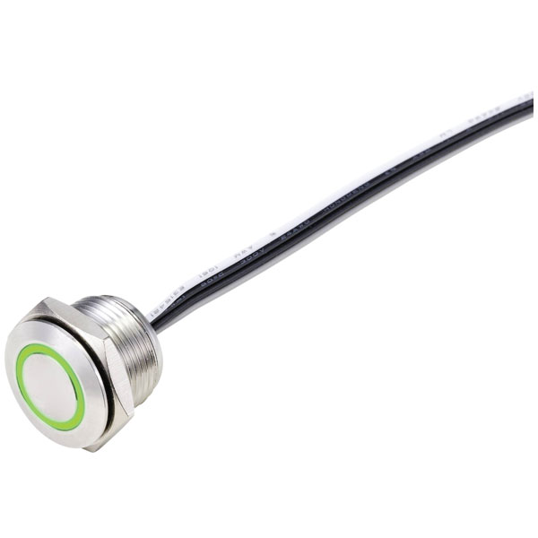 The TruComponents TC-9219104 pushbutton is a panel mount, momentary action switch with a SPST-NO configuration. It is pre-wired, rated for 24 V DC and 50 mA, and features green illumination. This IP65-rated switch is ideal for applications in industrial control panels and other environments where dust and water resistance is required.