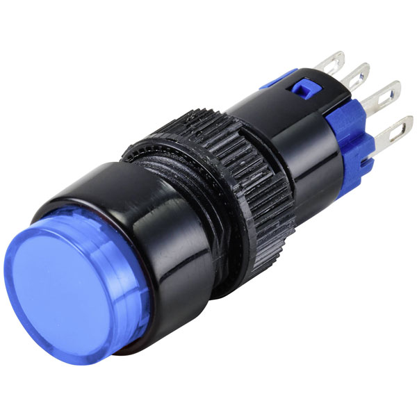 The TruComponents pushbutton switch, model TC-9428080, features an Off/On latch configuration with NO/NC contacts. It operates at a voltage of 250 V and a current rating of 3 A, making it suitable for a range of panel mount applications. This blue, non-illuminated switch is designed for solder connection and offers IP40 protection, ideal for indoor use in control panels and electronic devices.