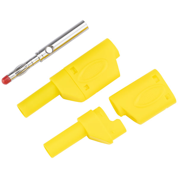 These TruConnect yellow safety sheathed 4mm stackable test plugs have a solder bucket termination, a rigid insulating sleeve and soft ends for self-assembly of test leads.