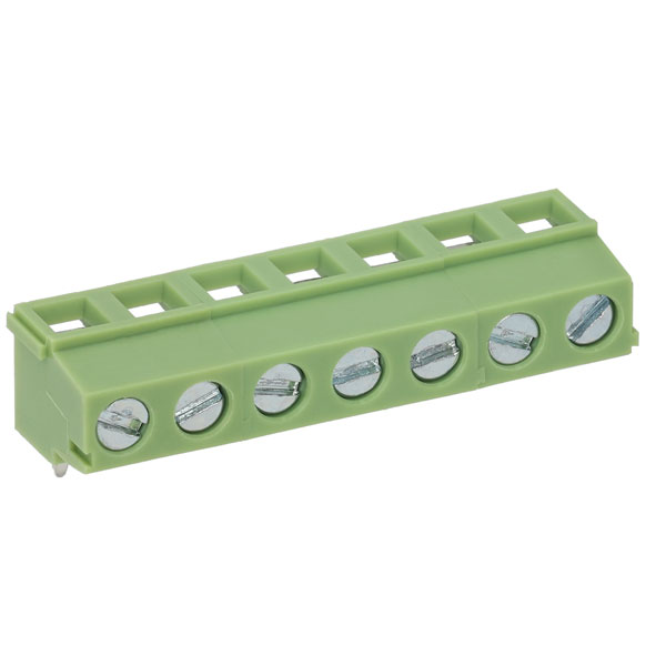 Low profile, horizontal mounting, moulded rising clamp terminal block with 7 poles, 5.08mm pitch.