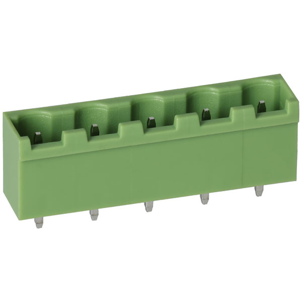 Top entry, closed ended, header connector with 5 poles, 7.62mm pitch.