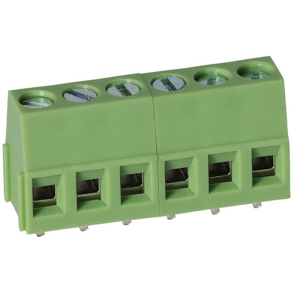Vertical mounting, moulded, rising clamp terminal block with 6 poles, 5mm pitch.