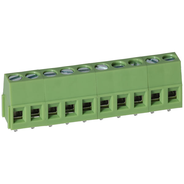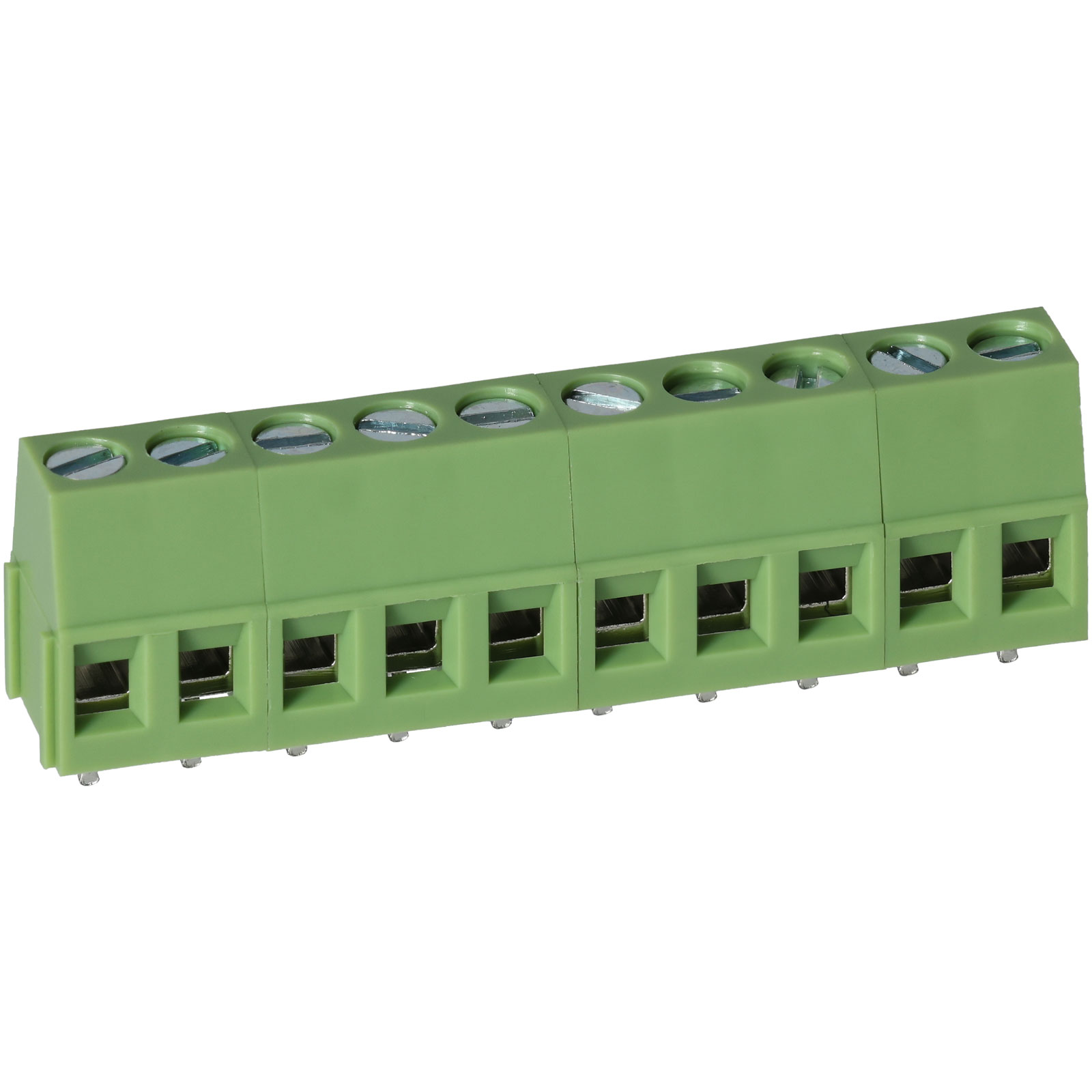 Vertical mounting, moulded, rising clamp terminal block with 10 poles, 5mm pitch.