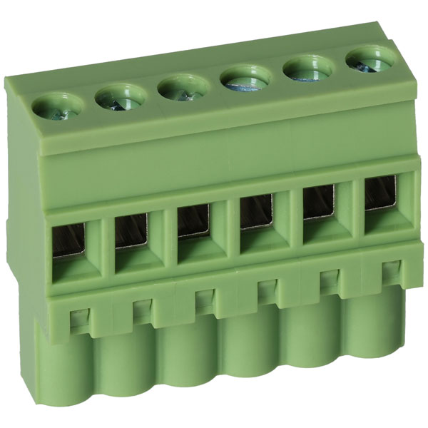 Rising clamp, female, plug-in, vertical terminal blocks with 6 poles, 5mm pitch.