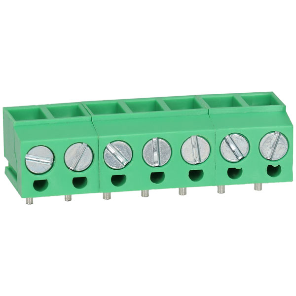 Low profile, horizontal mounting, wire protector, moulded terminal block with 7 poles, 5mm pitch.