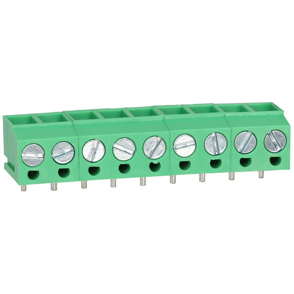 Low profile, horizontal mounting, wire protector, moulded terminal block with 9 poles, 5mm pitch.