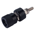 Black insulated binding post with M4 thread designed to connect single-wire leads. The coloured cap screws up and down, and is designed to clamp on to the connecting wire.