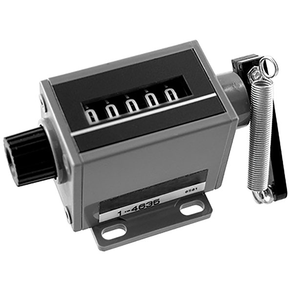 These compact 5-figure stroke counters are designed for high-speed, long-life applications where space is limited. The 1-4635 model has a right-hand shaft with a top-coming direction of travel, with left-hand side reset knob. Featuring an advanced drive system, they offer exceptional durability and accuracy at high operating speeds. Ideal for copiers, printing presses, cut-off machines, and piece-part counting.