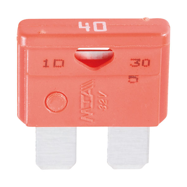 An automotive standard flat blade fuse that is one of the most commonly used in cars and trucks. This orange 40A fuse has been manufactured from transparent thermoplastic with copper plated contacts.