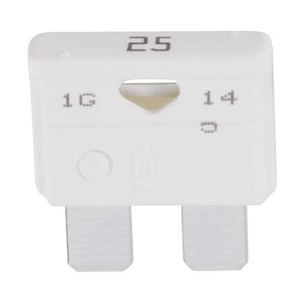 An automotive standard flat blade fuse that is one of the most commonly used in cars and trucks. This white 25A fuse has been manufactured from transparent thermoplastic with copper plated contacts.