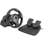 The compact USB steering wheel with acceleration and braking pedals, along with vibration feedback effects, provides realistic racing both on the PC, Playstation 2 and Playstation 3.