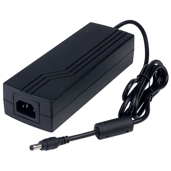 High quality desktop switch mode PSU from PowerPax UK featuring a standard IEC320 C14 inlet and a 1.2m captive lead with a 2.1 x 5.5 x 12mm female, centre positive DC connector.