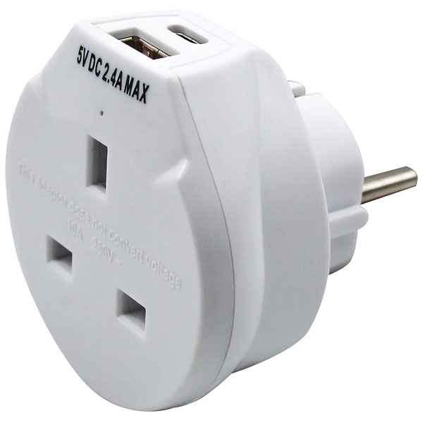 It features dual USB ports for efficient charging of electronic gadgets when abroad.