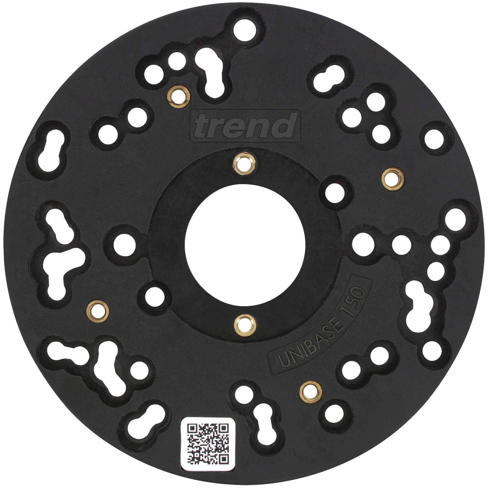 Trend UNIBASE/150 Universal Plunge Router Sub-Base with 13 Hole Patterns to suit most 1/4in plunge routers, including 18V cordless models.