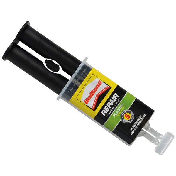 The UniBond Epoxy Repair Plastic is a 2-part water-resistant epoxy adhesive that sets solid in 5 minutes. Ideal for strong quick bonding and repairing of most plastics. Can be sanded, drilled and painted. Designed to be workable for 4 minutes while the bond is being created, allowing for the adhesive to be repositioned into the correct position.
