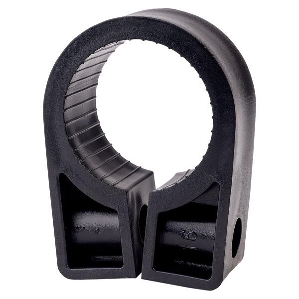 A heavy-duty plastic cleat for securing large diameter cables.