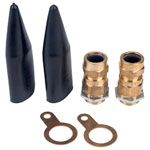 Each kit contains a brass cable gland with earthing tag and rubber cover.