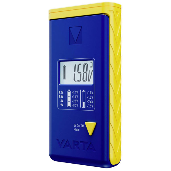 Varta's LCD battery tester, model 00893 101 111, is a reliable tool for assessing battery charge levels. It features a reading range suitable for 1.2 V, 1.5 V, 3 V, and 9 V batteries, including rechargeables. This compact battery tester is ideal for checking the battery level in household and electronic devices.